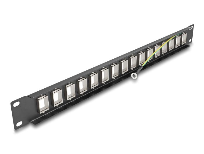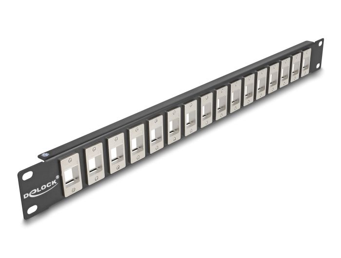 Tento patch panel značky Delock lze namontovat do 19” skříně. Díky svým normalizovaným rozměrům je vhodné pro snadnou montáž zacvaknutím 16 modulů Keystone.