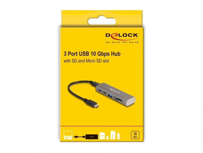 Delock 3 portový rozbočovač USB 10 Gbps včetně čtečky karet SD a Micro SD s konektorem rozhraní USB Type-C™
