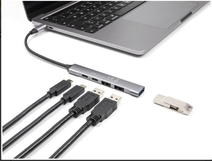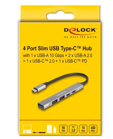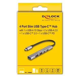 Delock 4-portový tenký Hub USB Type-C™ mající 1 x USB 10 Gbps Typ-A + 2 x USB 2.0 Typ-A + 1 x USB 2.0 USB Type-C™ a PD 9