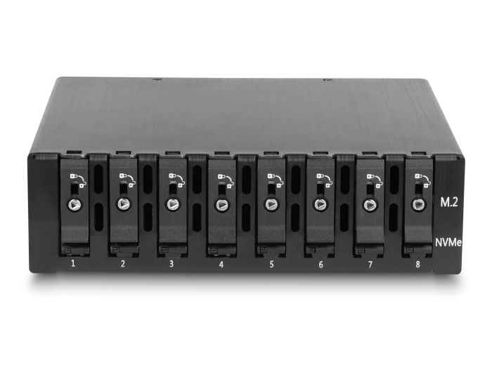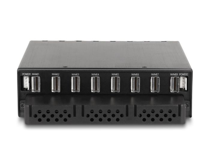 Tento pevný kovový mobilní rack značky Delock lze nainstalovat do 5.25” pozice na PC, IPC nebo krytu na serveru a umožňuje provoz až 8 SSD M.2 NVMe. Aby byla zajištěna maximální možná rychlost každého portu, má každý slot svůj vlastní konektor Slim SAS SFF-8654.