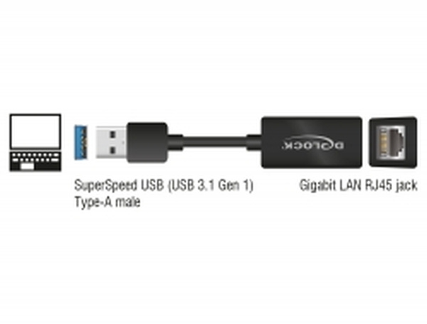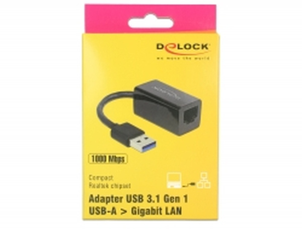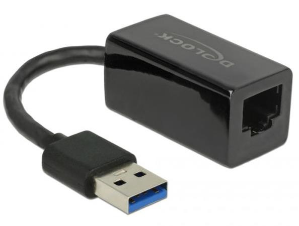 Delock Adaptér Super Speed USB (USB 3.1 Gen 1) s USB Typ-A samec > Gigabit LAN 10/100/1000 Mbps kompaktní černý