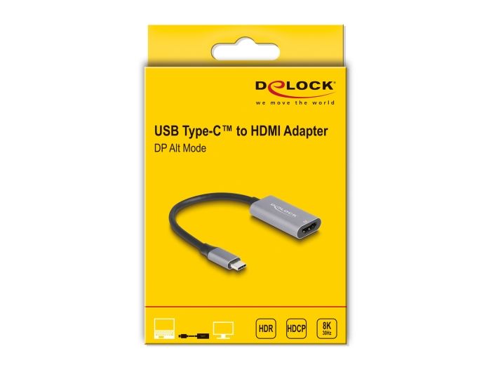 Tento adaptér značky Delock je vhodný pro připojení monitoru HDMI v rozlišení 8K Ultra HD (7680 x 4320 @ 30 Hz) k počítači s rozhraním USB-C™ a s podporou alternativního režimu DisplayPort. Díky tomu může být adaptér připojen k různým notebookům jako je MacBook, Chromebook a podobné. Kromě toho, může adaptér pracovat na rozhraní Thunderbolt™ 3 nebo Thunderbolt™ 4.