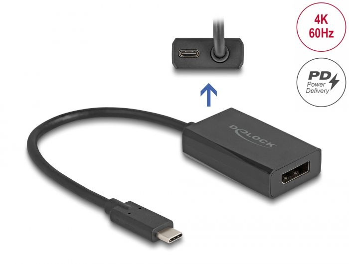 Delock Adaptér ze zásuvku DisplayPort na zástrčky USB Type-C™ (DP Alt Mode), 4K, s PD o výkonu 85 W
