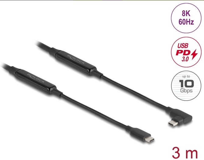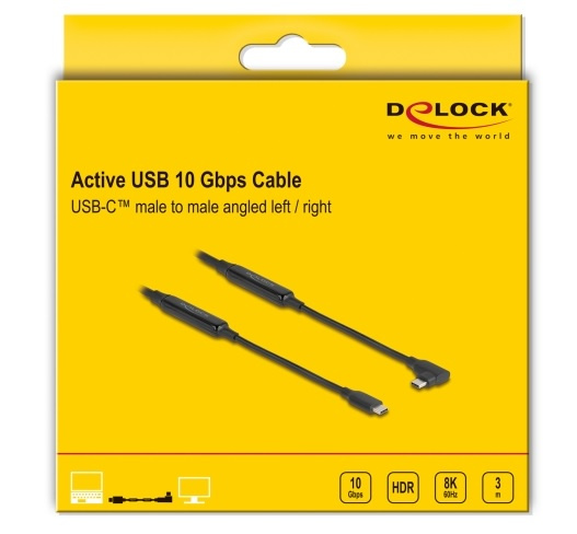 Delock Aktivní kabel USB 10 Gbps, ze zástrčkového rozhraní USB Type-C™ na zástrčkové, pravoúhlý, levý / pravý, 3 m, 8K