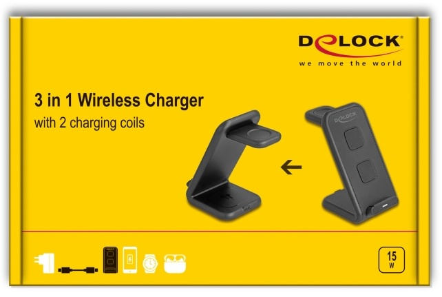 S touto nabíjecí stanicí značky Delock lze současně bezdrátově nabíjet chytrý telefon, chytré hodinky (Apple) a jedno další zařízení. Díky přenosu energie indukcí už nejsou potřeba nabíjecí kabely a konektory jsou chráněny. U vhodně vybavených chytrých telefonů nabíječka podporuje rychlonabíjení výkonem až 15 W.