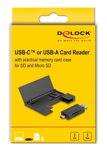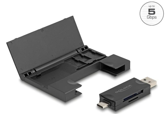 Delock Čtečka karet USB 5 Gbps, USB Type-C™ / Typ-A na paměťové karty SD a Micro SD s praktickým pouzdrem na paměťové ka