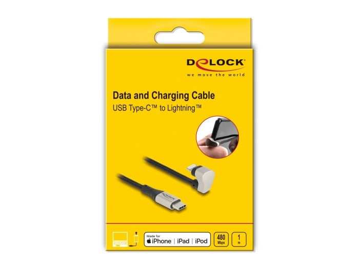Delock Datový a nabíjecí kabel USB Type-C™ na Lightning™ pro iPhone™ a iPad™, 180°, pravoúhlá 1 m MFi