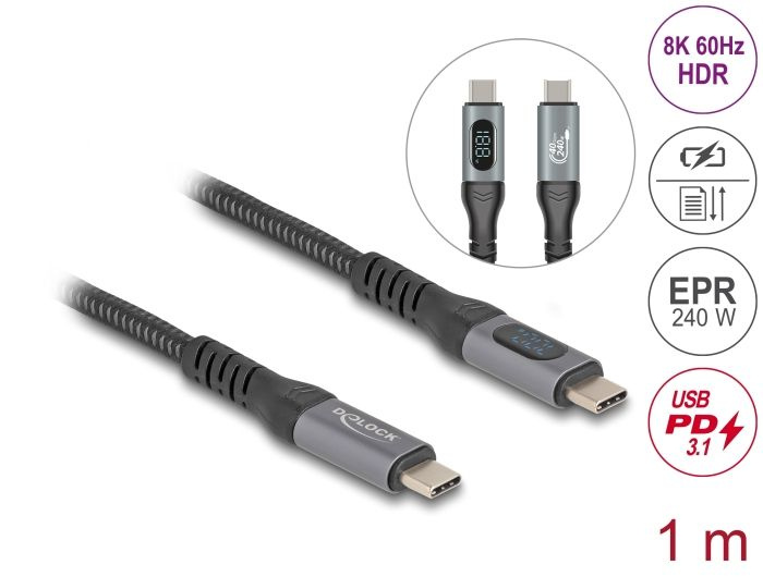 Delock Datový a rychlonabíjecí koaxiální kabel USB 40 Gbps, 1 m, 8K 60 Hz, USB PD 3.1, rozšířený rozsah výkonu, 240 W