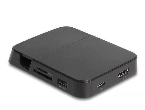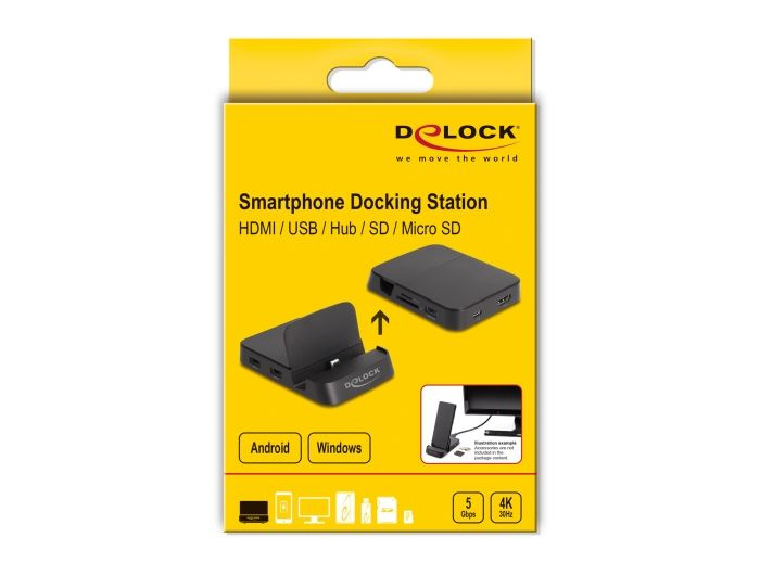 Delock Dokovací stanice na chytré telefony s rozlišením 4K a s integrovaným držákem — HDMI, USB, Hub, SD a Micro SD
