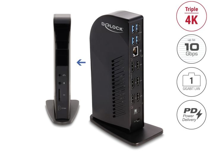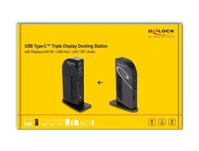 Delock Dokovací stanice na tři displeje USB Type-C™ s rozhraními DisplayLink® 4K / USB Hub / LAN / SD / Audio / PD 96 W