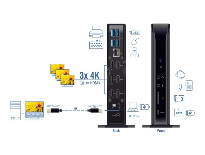 Tuto dokovací stanici značky Delock lze k počítači připojit rozhraním USB-C™ DP Alt Mode, Thunderbolt™ 3 nebo Thunderbolt™ 4 a poskytuje několik různých rozhraní. Na výstupech pro monitory lze provozovat až tři monitory současně. Pět integrovaných portů USB umožňuje využívat periférie a další port USB lze používat k nabíjení mobilních zařízení. Funkcionalitu doplňují konektory pro mikrofon a reproduktor, přípojka sítě Gigabit, ale i čtečka karet na paměťové karty SD.
