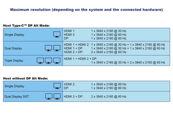 Zaručit lze rozlišení nejvýše 4K na všech portech, bez ohledu na operační systém. Vzhledem k čipové sadě grafické karty lze používat funkce zrcadlení a rozšíření obrazovek na DisplayLink® v operačních systémech Windows a Mac OS.