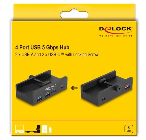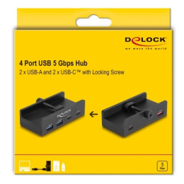 Delock Externí 4 portový rozbočovač USB 5 Gbps, 2 x USB Typ-A a 2 x USB Type-C™, s pojistným šroubem
