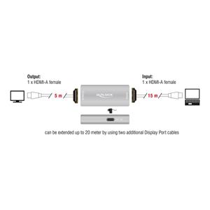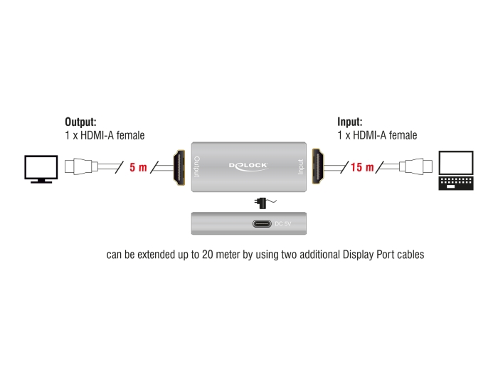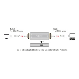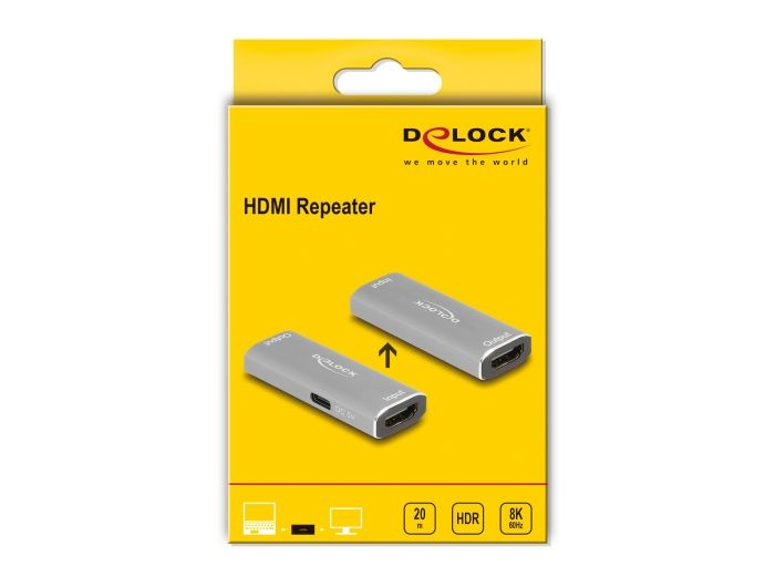 Tento HDMI repeater od Delocku může být použit pro zesílení signálu HDMI až do 20 m. Až 15 m dlouhý kabel může být připojen z PC nebo notebooku ke vstupnímu portu repeatru, a na druhé straně až 5 m dlouhý kabel k výstupnímu portu repeatru, který je pak připojen k display nebo TV. Repeater podporuje rozlišení až do 8K Ultra HD (8K @ 60 Hz) a je zpětně kompatibilní s Full-HD 1080p.