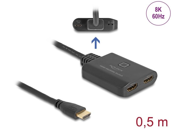 Delock HDMI Switch 2 x vstupní porty HDMI na 1 x výstupní port HDMI, 8K 60 Hz s integrovaným kabelem 50 cm