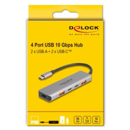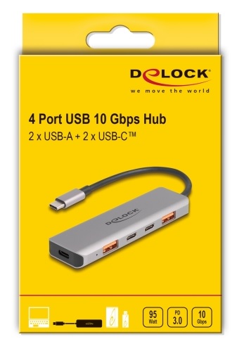 Delock Hub USB 10 Gbps se 2 porty USB Typ-A + 2 porty USB Type-C™ s konektorem USB Type-C™ a s PD 95 W