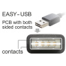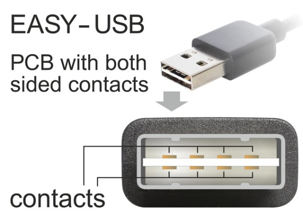Tento kabel od Delocku s EASY-USB samec může být připojen do portu USB-A samice oběma směry. Díky tomu lze port samce použít v obou polohách a dělá tak připojení kabelu snadné.