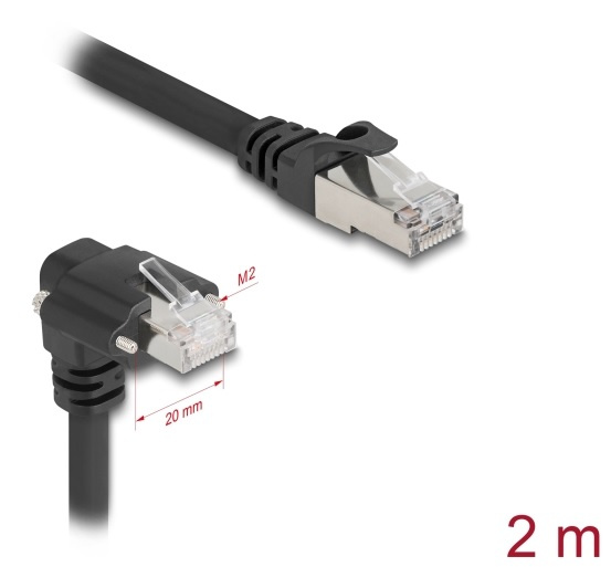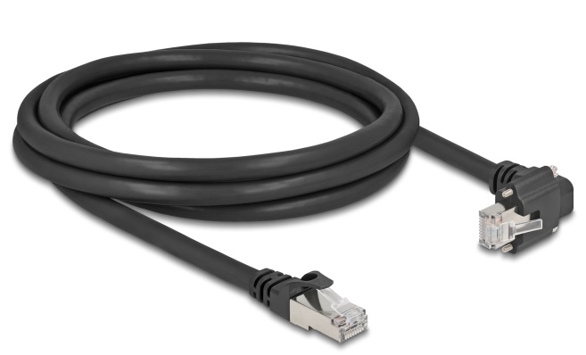 Delock Kabel kamery GigE se zástrčkou RJ45, pravoúhlý 90°, se šrouby, na zástrčku RJ45, Cat.6, S/FTP, 2 m, černý
