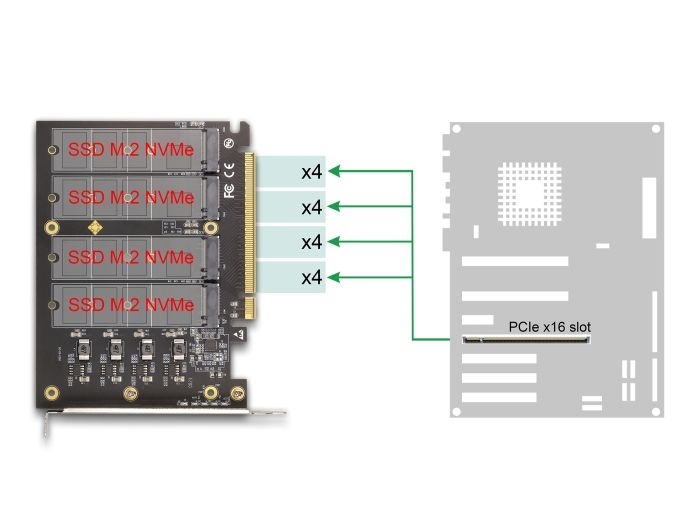 Tato karta vyžaduje PCIe rozvětvení na základní desce k rozdělení signálu PCIe, aby bylo možno využívat více portů.