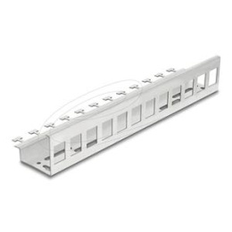 Tento držák Keystone značky Delock lze namontovat na stěnu nebo na 35 mm DIN lištu. Díky standardizovaným rozměrům je vhodný pro snadné zasunutí 12 modulů Keystone.