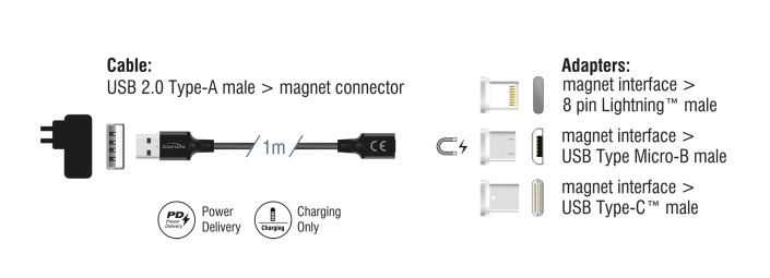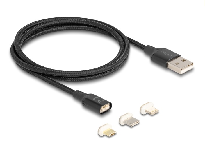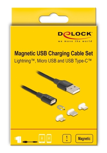Tento nabíjecí kabel USB od Delocku se vyznačuje technologií magnetů a umožňuje snadné a rychlé připojení a odpojení zařízení od zdroje napájení. Použitím jednoho ze tří přiložených magnetických adaptérů lze nabíjet různá mobilní zařízení, tablety atd. přes rozhraní 8 pin, Micro USB-B nebo USB Type-C™. Adaptéry jsou navrženy tak, aby zůstaly uvnitř portu zařízení. Tak to může zabránit poškození portu zařízení a rovněž působí jako ochrana proti prachu. Nabíjecí kabel USB se může okamžitě připojit k zařízení pomocí kulatého magnetického konektoru. Kabel je díky robustnímu textilnímu stínění a kovovému pouzdru na obou koncích kabelu velmi robustní a odolný.