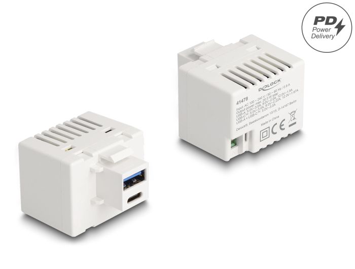 Tento modul značky Delock poskytuje nabíjecí porty USB Typ-A a USB Type-C™ Power Delivery (PD). Nabíjecí porty USB podporují běžné protokoly rychlého nabíjení. Připojená zařízení lze napájet výkonem až 20 W. Díky jeho normalizovaným rozměrům může být použit pro snadnou montáž např. do Keystone patchpanelové lišty nebo montážní krabice.