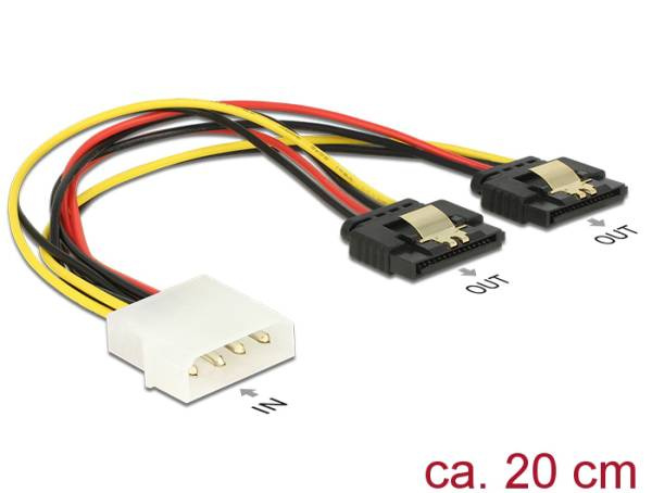 Tento kabel od Delocku umožňuje napájení dvou zařízení vybavených konektorem SATA 15 pin samice přes jeden volný Molex 4 pin napájecí konektor z napájecího zdroje. Kovové spony na SATA konektorech zajišťují, aby kabel spolehlivě zapadl na své místo.