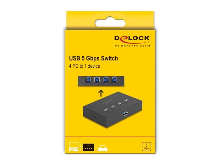 Tento USB přepínač značky Delock umožňuje sdílet jedno periferní zařízení USB 5 Gbps se čtyřmi různými počítačovými systémy. Tím zamezíte vzniku nákladů na nákup více periferních zařízení i nutnosti vyměňovat kabely z jednoho systému na jiný.