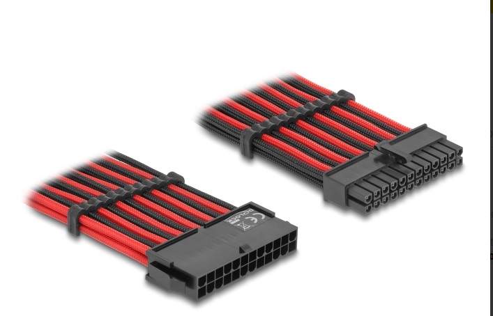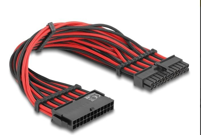 Delock Prodlužovací kabel z 24-pinové zástrčky ATX na 24-pinovou zásuvku ATX, s textilním opletením, červenočerný, 30 cm