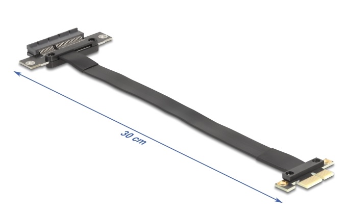 Tato karta PCI Express Riser značky Delock se k připojení karty PCI Express x4. Ohebný kabel umožňuje prostorově úspornou instalaci do skříně počítače.