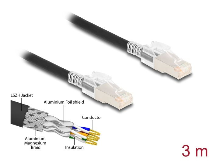 Delock Síťový kabel RJ45 Cat.6A S/FTP se sadou bezpečnostních sponek, 3 m dlouhý, černý