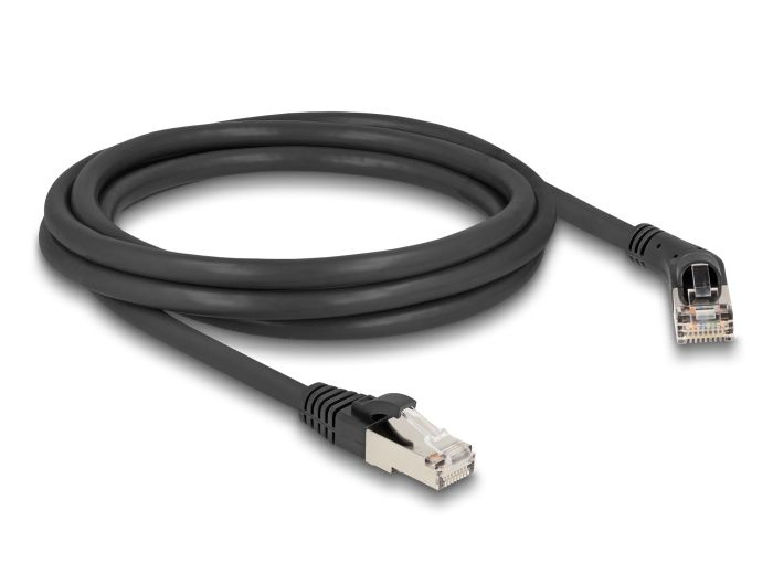 Delock Síťový kabel RJ45 Cat.6A S/FTP, ze zástrčky zalomené doprava 45° na přímou zástrčku, 2 m, černý