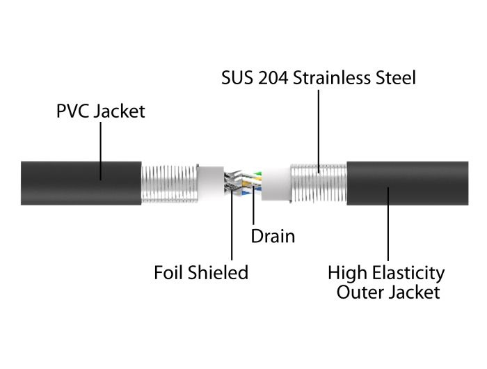 Tento robustní síťový kabel nabízí zvýšenou ochranu proti poškození a jiným vlivům, jako například vlhkosti, prachu nebo škodlivým hlodavcům. Přesto, že je opláštěn kovem, je tento kabel velmi ohebný.