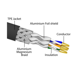 Tento síťový kabel je ideální k používání venku a nabízí zvýšenou odolnost proti ultrafialovému záření, chladu, horku, vlhkosti a korozi. Dále má zvýšenou odolnost proti ohýbání a je ideální k užívání v průmyslových prostorech.
