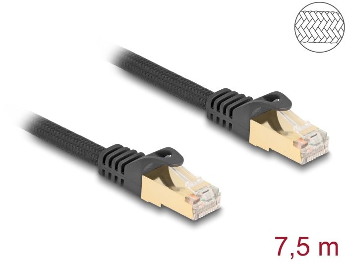 Delock Síťový kabel RJ45 s pleteným opláštěním, Cat.6A, ze zástrčky S/FTP na zástrčku, 7,5 m, černý