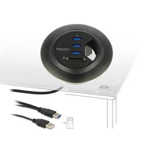 Tento hub od Delocku může být nainstalován do stávajícího otvoru v pracovním stole s průměrem 60 mm nebo 80 mm pro vyvedení kabelů pro monitor, klávesnici a myš. Hub nabízí najednou tři porty USB Typ-A samice a jednu čtečku SD karet se dva sloty. Přenos dat a napájení je zajištěno skrze jedno USB 3.0 Typ-A samce a jedno USB 2.0 Typ-A samce. Vzdálenost mezi třemi konektory může být maximálně 20 cm, protože oba kabely jsou navzájem propojeny.