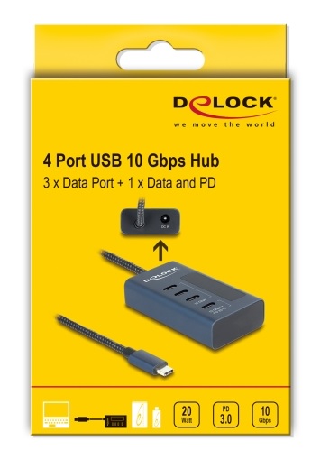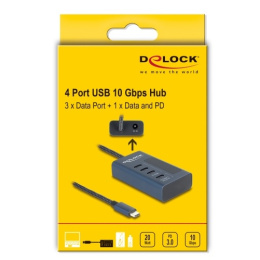 Delock USB 10 Gbps Hub se 4 porty USB Type-C™, z nichž 3 x datové porty a 1 x datový port s napájecím výkonem až 20 W