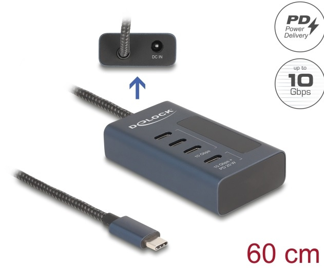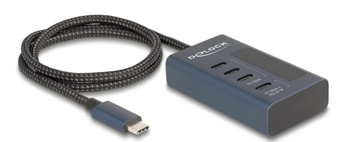 USB hub od Delocku může být připojen přes rozhraní USB Type-C™ k PC nebo notebooku. Má čtyři konektory USB-C™. Lze připojit různá zařízení USB, jako například USB flash paměť, čtečku karet, externí pouzdro atd.