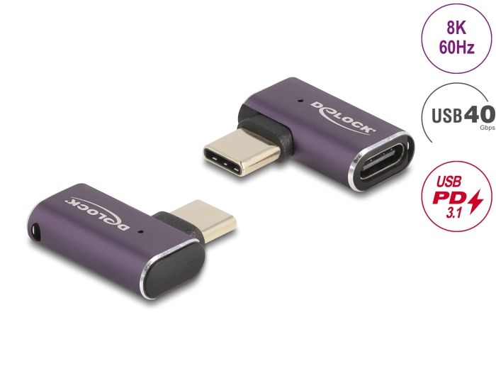 Delock USB Adaptér 40 Gbps USB Type-C™ PD 3.1 240 W samec na samice pravoúhlý levý / pravý 8K 60 Hz kovová