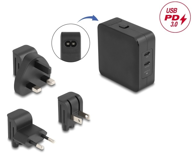 Tuto USB nabíječku značky Delock lze používat k nabíjení dvou zařízení s rozhraním USB. Porty jsou vybaveny rozhraním USB Type-C™ Power Delivery (PD 3.0), takže podporovaná zařízení lze napájet výkonem až 65 W.