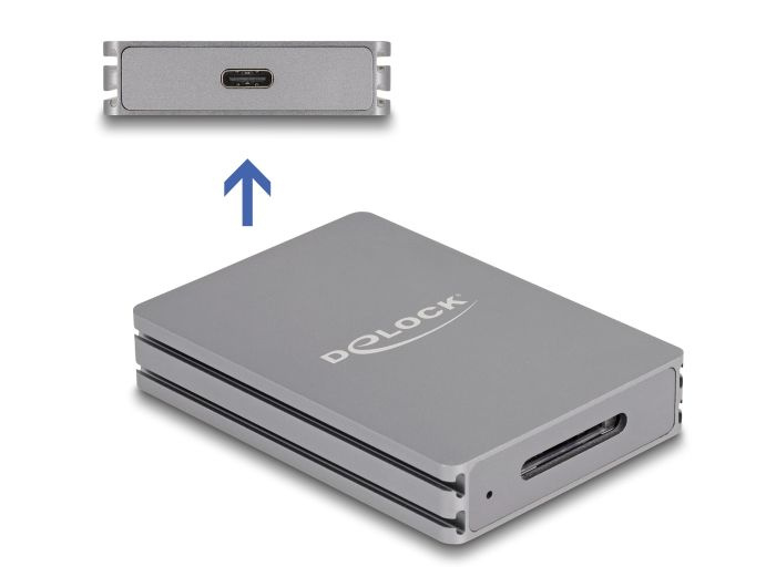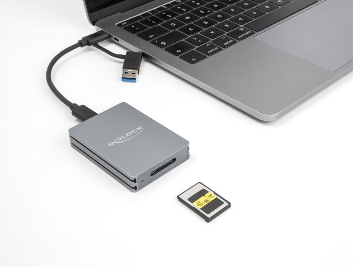 Čtečka karet od Delocku může být použita pro čtení a zápis na CFexpress paměťové karty. Čtečka karet může být připojena k PC nebo mobilnímu zařízení přes rozhraní USB.