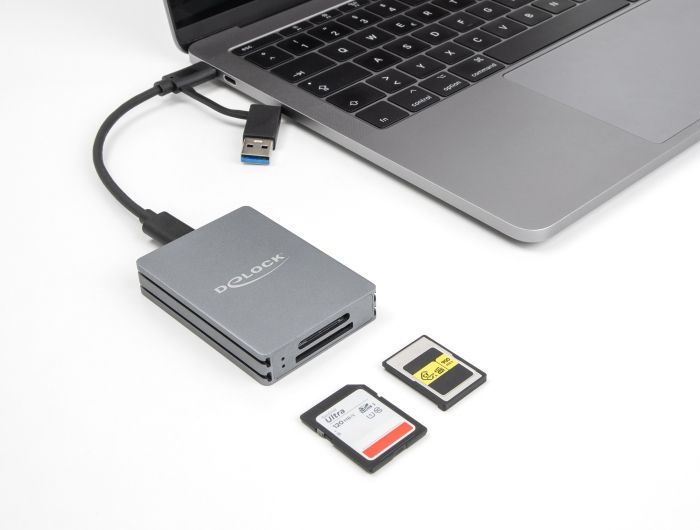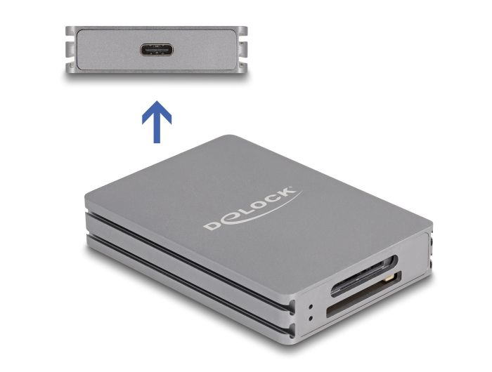 Čtečku karet značky Delock lze používat ke čtení z paměťových karet SD a CFexpress a k zápisu na ně. Čtečka karet může být připojena k PC nebo mobilnímu zařízení přes rozhraní USB.
