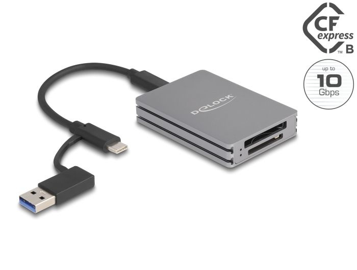 Čtečku karet značky Delock lze používat ke čtení z paměťových karet SD a CFexpress a k zápisu na ně. Čtečka karet může být připojena k PC nebo mobilnímu zařízení přes rozhraní USB.