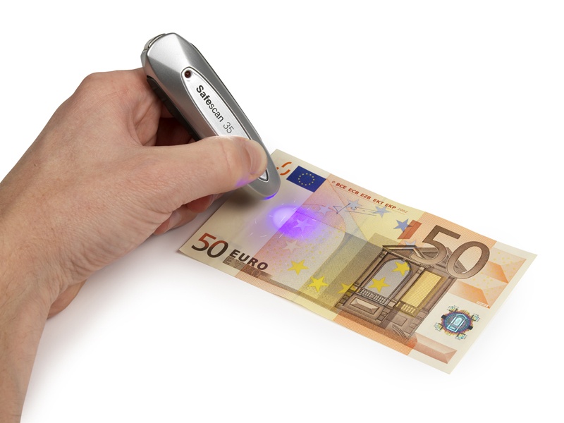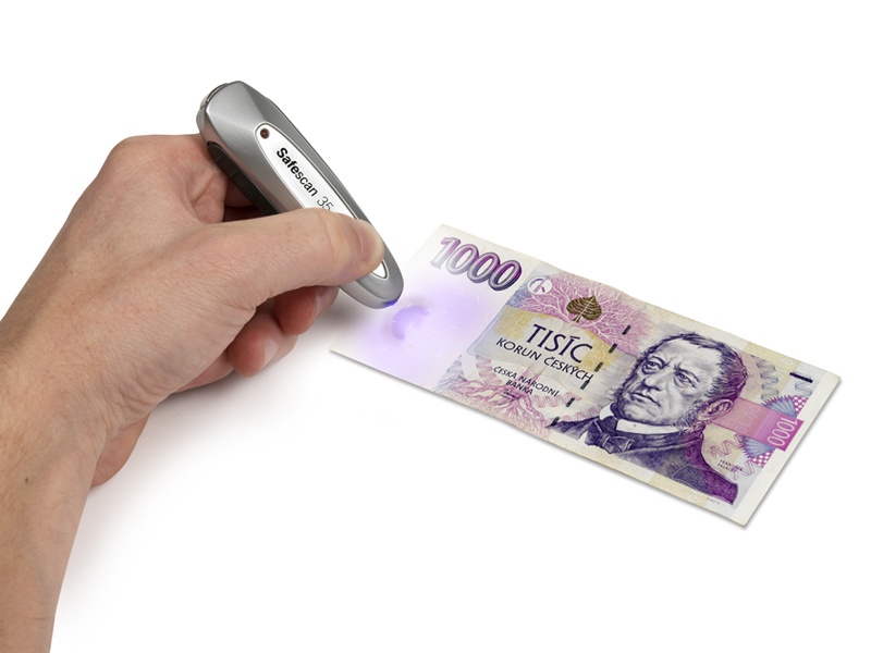 Kompaktní detektor Safescan k ověření pravosti bankovek třemi různými způsoby: UV, magnetické vlastnosti a bezpečnostní proužek.