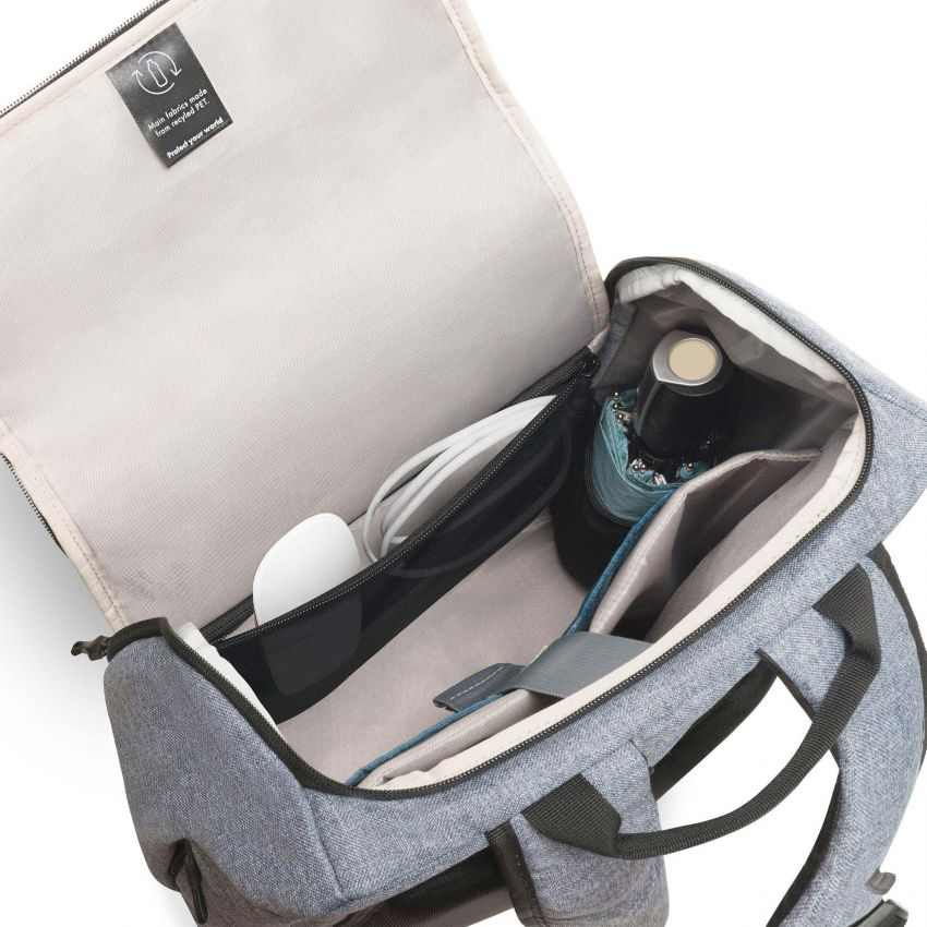 The Eco Backpack MOTION offers ideal protection for laptops between 13 and 15.6" thanks to its high-density foam (HDF) padding. The slip pocket provides reliable protection for tablets up to 12.9". The spacious main section is divided so that documents and accessories can be stored separately. There is space for your water bottle or umbrella in the mesh pockets inside of the bag. The front pocket has practical smaller compartments so you can organise smaller items like your smartphone, pens or chargers. The additional zipper on the side of the backpack provides quick access to the main compartment. You can therefore ensure that everything you need is always on hand. The backpack's ergonomic padding makes it comfortable to wear on your back and the padded shoulder straps can also be adjusted for further comfort. The bag is made of water-repellent material to protect the contents even on rainy days. The Eco Backpack MOTION is therefore perfect for you if you are always on the go and want to support the recycling of PET bottles with an eco-friendly bag.