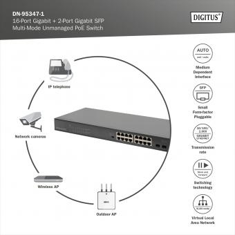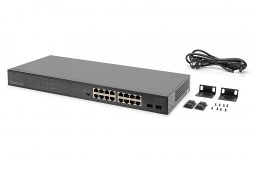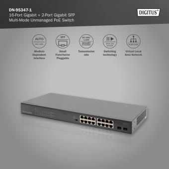 DIGITUS 16-Port Gigabit + 2-Port Gigabit SFP Multi-Mode Unmanaged PoE Switch