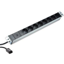 Hliníková jednotka PDU 1U, montáž do racku, 8x zásuvka CEE 7/7 10A, 250 VAC 50/60 Hz, zástrčka IEC C14, předřazená pojistka