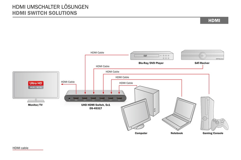 Přepínač Digitus 4K HDMI 5x1 umožňuje pohodlně přepínat mezi 5 vstupními zdroji HDMI (DVD / Blu-Ray Player, herní konzole, streaming boxy, digitální přijímače atd.) Pomocí dálkového ovládání, inteligentního automatického rozpoznávání nebo alternativně přepínáním samotný spínač. Potíže s připojováním kabelů jsou minulostí. Díky podpoře Ultra HD 4K (60 Hz) zažijte svůj mediální obsah v brilantně ostrém rozlišení.
