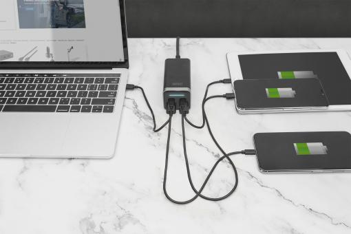 Kompaktní nabíječka pro zařízení, jako jsou notebooky, smartphony nebo tablety. Nejnovější technologie GaN je mimořádně účinná a dokáže nabíjet zařízení až čtyřikrát rychleji než běžné nabíječky.
