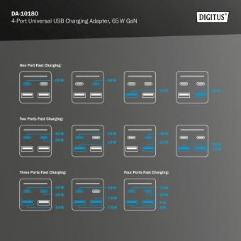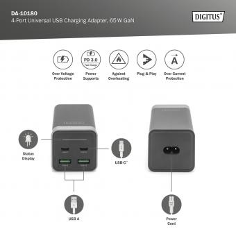 Čtyřportový nabíjecí adaptér USB od společnosti DIGITUS® je výkonné nabíjecí řešení pro každodenní použití s nejnovější technologií GaN. Vysoce výkonný adaptér má maximální výstupní výkon 65 W. Je vybaven 2x porty USB-C a 2x porty USB-A, podporuje celkový výkon až 65 W, a proto může nabíjet 4 zařízení současně. Je kompatibilní s nejběžnějšími protokoly rychlého nabíjení, a proto je kompatibilní téměř se všemi zařízeními. Integrovaná ochrana proti přepětí, nadproudu a zkratu zajišťuje větší bezpečnost. Integrovaná ochrana proti přehřátí navíc zabraňuje možnému přetížení a poškození nabíječky nebo připojených zařízení.